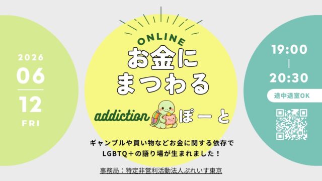 お金にまつわるアディクション・ぽーと参加申込 2026年6月12日(金) 偶数月の第二金曜日の開催です 時間は19時~20時30分です💛 〜ぽからはじまる物語2024~ LGBTQ+の方がアディクション(依存)につい […]